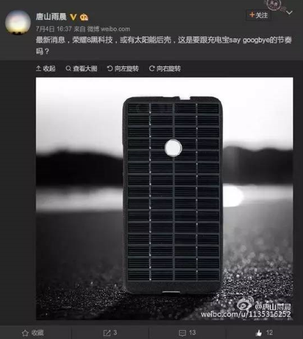 微博認(rèn)證信息為騰訊視頻商務(wù)主編的用戶曝出猛料,即將發(fā)布的榮耀8將會搭載太陽能面板。這意味著以后電量低又不方便充電的時候,只需把榮耀8曬曬太陽就能將光能轉(zhuǎn)換為電能,聽起來不錯,實現(xiàn)的可能性有多大呢!