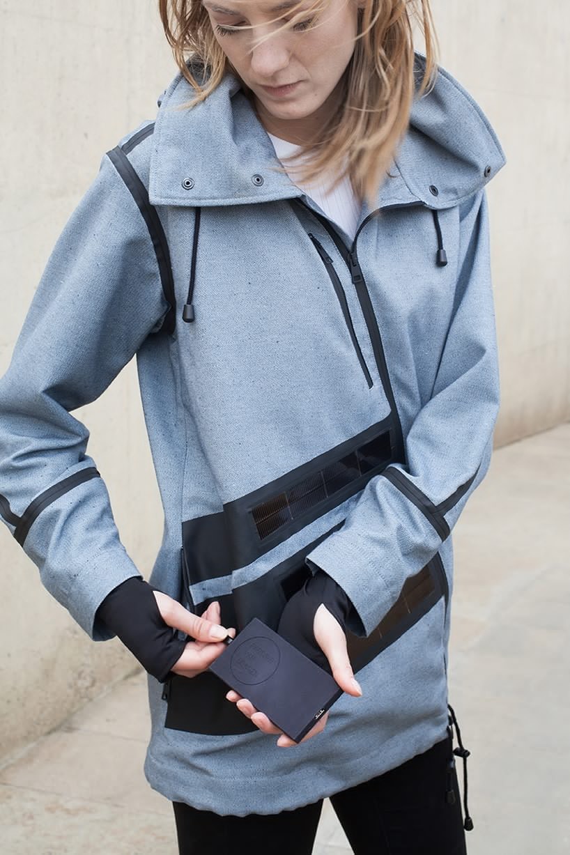 夾克上的太陽能電池板被設(shè)計成顯眼的三斜條,通過壓層法嵌于衣服中,感應(yīng)式充電系統(tǒng)可以為智能手機無線充電1-2個小時,其它設(shè)備借助USB線也可以充電。在風(fēng)衣的內(nèi)襯中,還有一個移動電源,天氣不好電力不夠的時候可以派上用場。