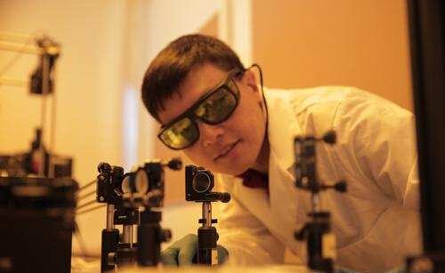 Hongrui Jiang觀察光源照亮新一代側向太陽能電池的校準情形。他與研究小組開發的太陽能電池可從入射光采集較現有技術更多3倍的電量。