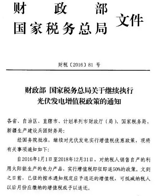 昨日深圳市某地稅局官方微信爆料稱,國家財政部、國家稅務總局下達了《關于繼續執行光伏發電增值稅政策的通知》,通知中稱“經國務院批準,繼續對光伏發電實行增值稅優惠政策”、“自2016年1月1日至2018年12月31日,對納稅人銷售自產的利用太陽能生產的電力產品,實行增值稅即征即退50%的政策。文到之日前,已征的按本通知規定應予退還的增值稅,可抵減納稅人以后月份應繳納的增值稅或予以退還?!?