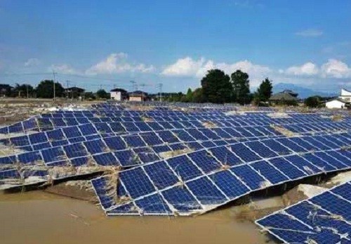 無獨有偶,2015年9月,日本茨城縣遭遇創(chuàng)紀錄的連續(xù)暴雨,發(fā)生了河水漫過堤壩的“倒灌”災(zāi)害,百萬太陽能陣列被洪水淹沒(如圖2)。