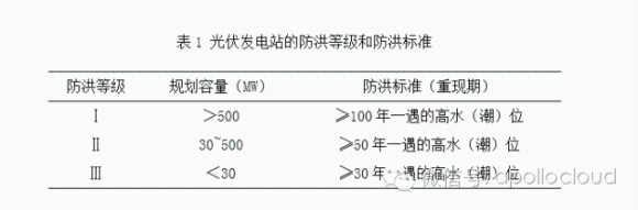 三、光伏電站設(shè)計中的防洪要求光伏電站,特別是集中式的中、大型光伏電站,在設(shè)計過程中必須充分考慮站址及其周圍區(qū)域的工程地質(zhì)地貌情況,做好相應(yīng)的防洪設(shè)計,以避免或減輕洪澇災(zāi)害發(fā)生時可能造成的損失。根據(jù)《光伏發(fā)電站設(shè)計規(guī)范》(GB 50797-2012)對光伏電站防洪設(shè)計的要求,按不同規(guī)劃容量,光伏發(fā)電站的防洪等級和防洪標準應(yīng)符合表1的規(guī)定。對于站內(nèi)地面低于表中所述高水位的區(qū)域,應(yīng)有防洪措施。防排洪措施宜在首期工程中按規(guī)劃容量統(tǒng)一規(guī)劃,分期實施。