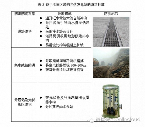 2、在光伏電站的建設(shè)過程中,必須嚴格按照相應(yīng)的防洪標準進行防洪設(shè)施施工,確保光伏電站的主設(shè)備(光伏組件、逆變器等)高于安全水位。對于建造在易發(fā)生洪澇災(zāi)害地區(qū)的光伏電站,可考慮多道設(shè)防,通過修建排水溝、深埋集電線路、建設(shè)雨水泵站等措施來最大程度減小隱患;