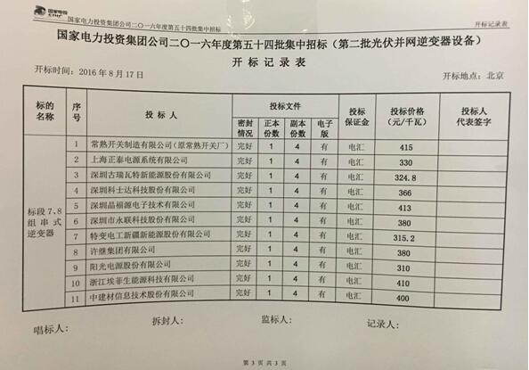 國電投2016年度組串式逆變器投標價格