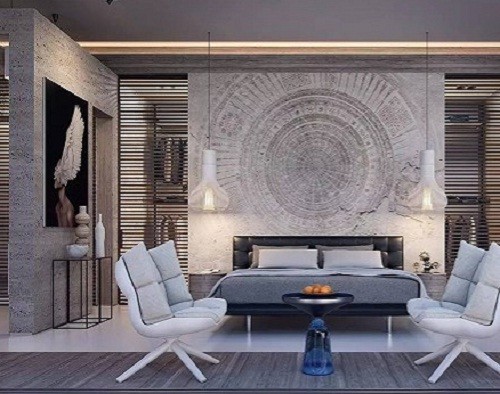下面就一起來看看主人套房。一個獨立的混凝土墻遮擋它后面的更衣室,這是一個非常驚人的聰明設計。