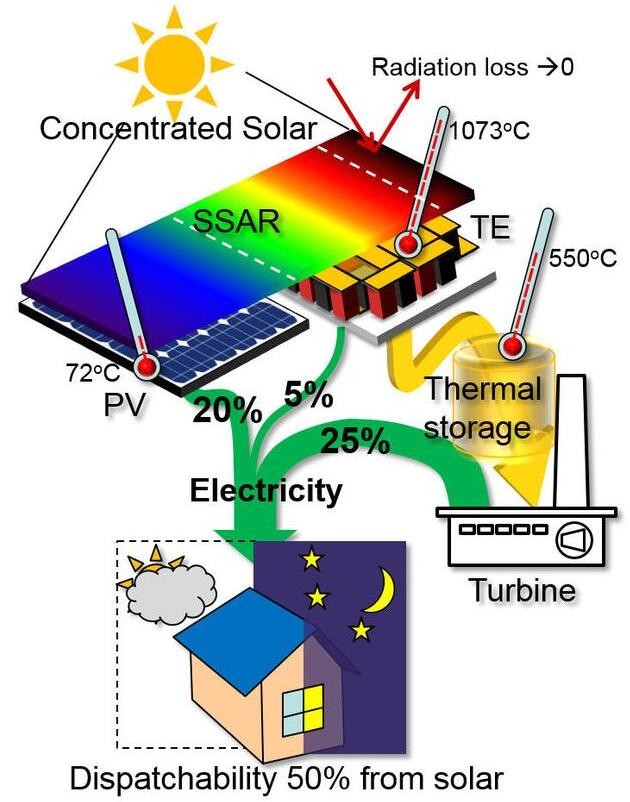 通過技術混搭,普渡大學的研究者們創造了一個全新的概念,它混合了現有三種太陽能技術,分別是PV、熱電技術(TE)和聚光太陽能技術。當然,該系統并不是簡單地將三種技術累加在一起,而是充分利用太陽光譜,構建了一個完整有序的系統。
