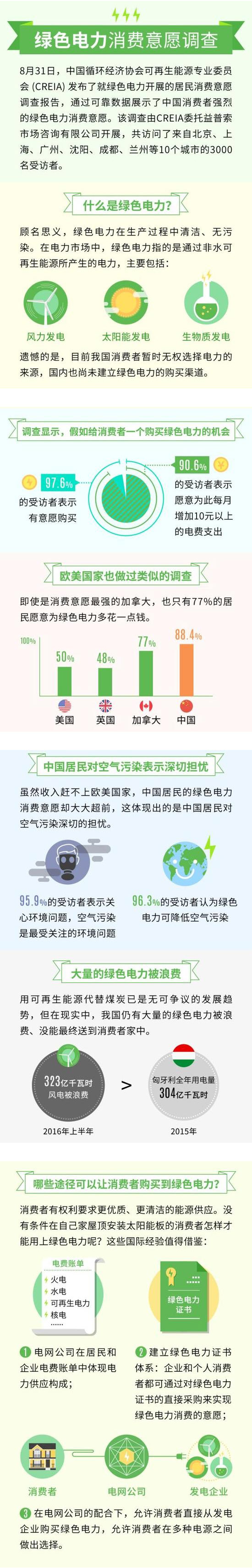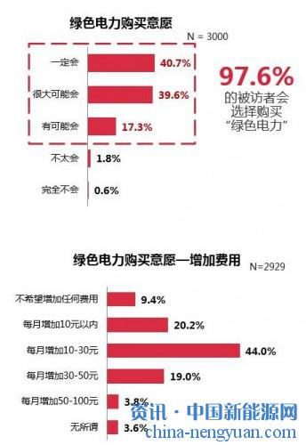 如果可以自行選擇供電來(lái)源,你是否愿意花費(fèi)更多的錢(qián)購(gòu)買(mǎi)污染更少的綠色電力?最新調(diào)查結(jié)果顯示,相比于傳統(tǒng)火電,中國(guó)消費(fèi)者購(gòu)買(mǎi)風(fēng)力發(fā)電、太陽(yáng)能發(fā)電、生物質(zhì)發(fā)電等非水可再生能源所發(fā)電力的意愿,超出了想象。來(lái)自全國(guó)10個(gè)城市的3000名受訪者中,有97.6%的人表示有意愿購(gòu)買(mǎi)綠色電力,其中高達(dá)90.6%的受訪者表示愿意為此每月增加10元以上的電費(fèi)支出。