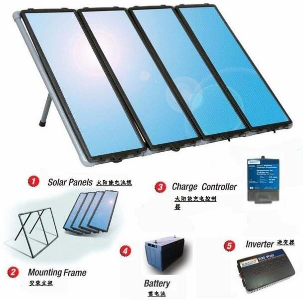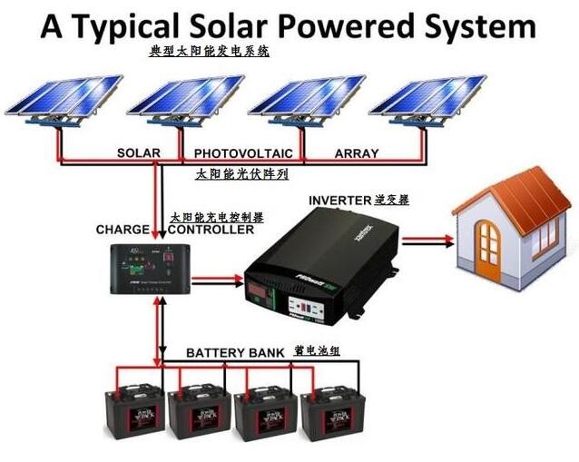 太陽能電池板依次排列形成太陽能光伏陣列,加大了太陽能的吸收面積也就增多了轉(zhuǎn)化的電能;太陽能通過太陽能充電控制器將轉(zhuǎn)化后的電能儲存在蓄電池組中,當(dāng)家庭中需要用電的時候,蓄電池組進(jìn)行放電,通過逆變器將直流電變?yōu)榧彝ビ媒涣麟?,供家庭日常生活使用?