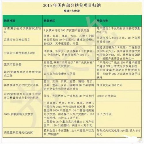 2015年3月,《光伏扶貧試點實施方案編制大綱(修訂稿)》,提出由地方政府對戶用和基于農業設施的光伏扶貧項目給予35%初始投資補貼,對大型地面電站給予20%初始投資補貼,國家按等比例進行初始投資補貼配置;同時光伏扶貧項目在還貸期內享受銀行全額貼息。
