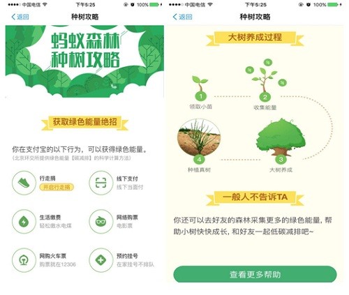 “碳賬戶”通過設計成帶有趣味性的“螞蟻森林”游戲,即用戶的步行、地鐵出行、在線繳納水電煤氣費、網上繳納交通罰單、網絡掛號、網絡購票等等行為,都會減少相應量的碳排放,從而可以在支付寶內種養一棵虛擬的樹。