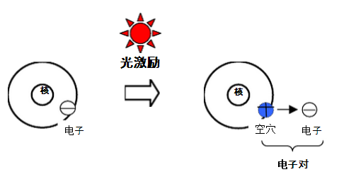 具體來說。首先,我們知道,物質都是由原子組成的,原子由原子核和圍繞原子核旋轉的電子組成。半導體材料處于穩定狀態時,原子核和核外電子緊密結合。當有外界激勵,例如光照射到器件上時,能量大于硅禁帶寬度的光子進入硅中后,會在P區、N區以及耗盡層(空間結構上等同于空間電荷區)中激發出光生電子-空穴對。通俗來講,就是原子核和電子的結合力因光的刺激而降低,電子擺脫了原子核的束縛,成為自由電子。如下圖: