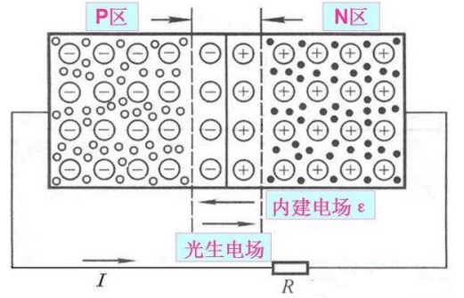 光生電場使得P區帶正電,N區帶負電,從而N區和P區之間就會產生電動勢,這就是光生伏打效應。當電池接上負載R后,光電流就可以從P區經負載流至N區。負載據此效應就可以得到一定的功率輸出。