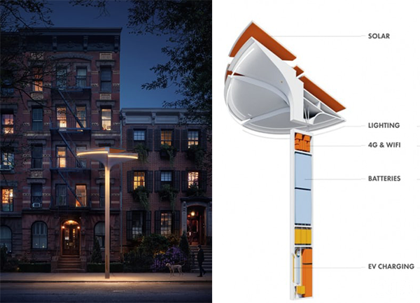 這款產(chǎn)品的外形非常具有現(xiàn)代感,荷葉式的頂端裝有裝有5千瓦的太陽能電池板組列,這樣可以讓其更多的接觸到太陽以便產(chǎn)生充足的電量。這里產(chǎn)生的能量一部分用于照明,一部分將輸入城市電網(wǎng),為城市供能。