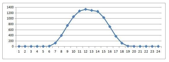 下圖1為該地區逐時出力的年平均值,即對365天的24小時逐時出力求平均。